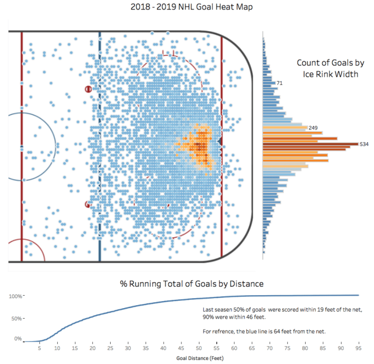 The final chart shows the distance in which goals were scored; its a running total by the distance from the net (in feet). You can see the total percentage climbs quickly. 50% of all goals were within 19 feet of the net and 90% of goals were within 18 feet of the blue line.