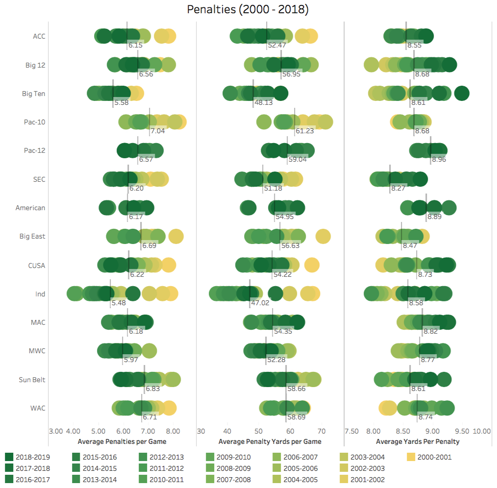 The graphic below is showing the average penalties, penalty yards, and yards per penalty per game per season. The most recent season being the darkest green (2018-2019) and the earliest season being yellow (2000-2001). Additionally, I’ve added the average line across all seasons per conference; basically this is the average of the averages.
