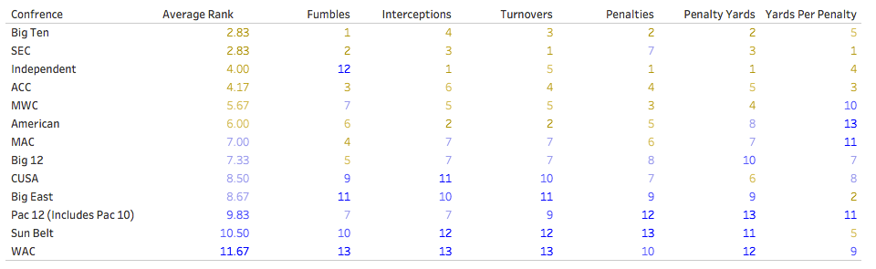 In Part 1 of my multi-part series College Football Conference Comparison, I looked at turnovers. This post will look at another measure of mistakes: penalties.