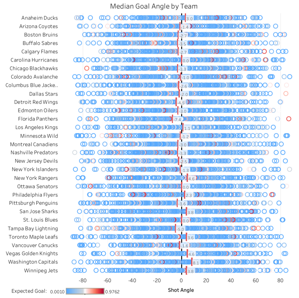 The first image shows every team’s goals last season as well as the median goal angle for those goals. The circles are colored based on their individual โExpected Goalโ value. Red means it had a high value, blue means it was low. Itโs worth reiterating that all circles in the graphic below are goals, so even a blue circle with a low expected goal value still ended up being a goal.