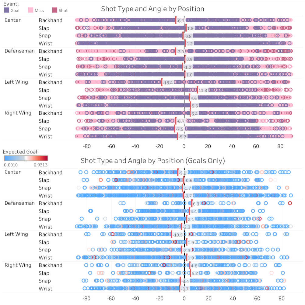 We also see wrist shot goals are distributed the most across all angles for all positions. This doesn’t mean the median angle is the closest to zero, but the purple circle for goals are basically a solid bar across most of the angles.