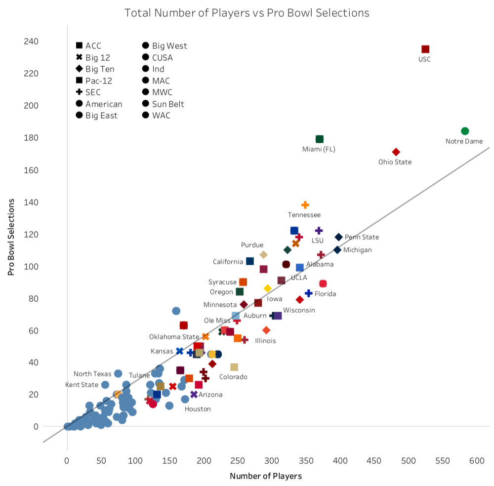 The third graphic looks at the total number of players schools have ever had in the NFL and the total number of Pro Bowl Selections they’ve had. The shape of the point shows what conference that school was in; the color of the dot is the school’s color. However, blue dots mean the school is not from a power five conference. I added the linear trend line as well to show which schools outperform others.