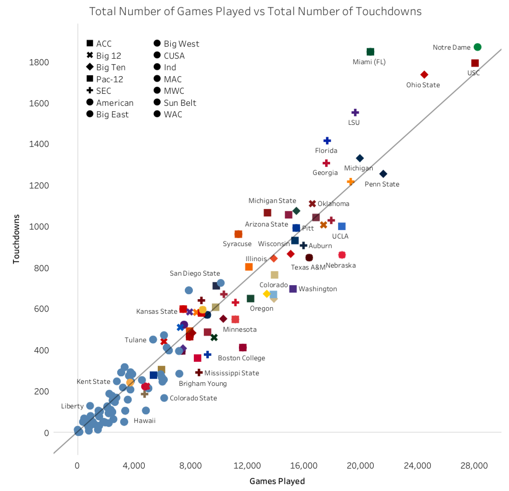 The fourth and final graphic looks at the total number of games played by players from a school and the total number of touchdowns they scored. The shapes and colors of the points are the same as above. Again, I added the linear trend line to show which schools outperform others.