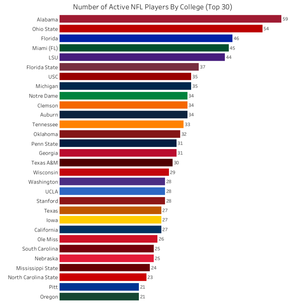 First, I looked into what colleges have the most players currently on NFL rosters.