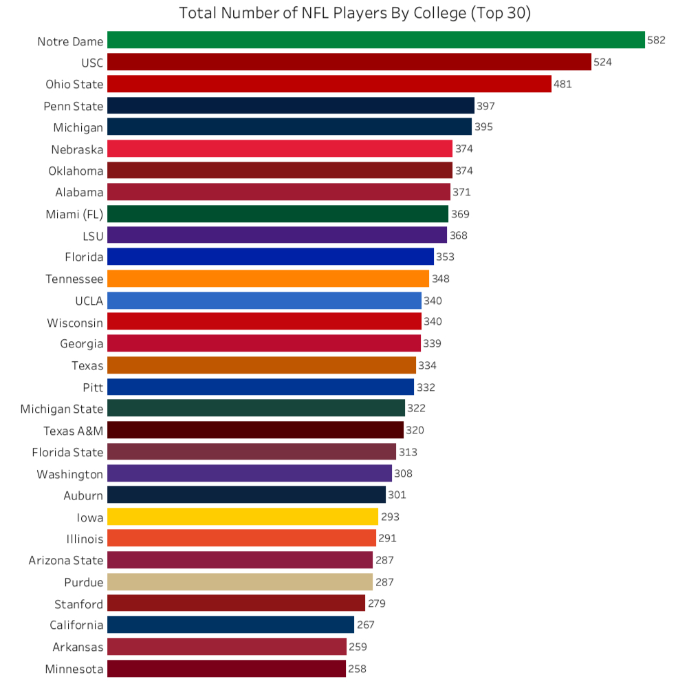 Notre Dame, USC, and Ohio State take the top three spots which is not surprising considering their historically successful franchises. Players like Tim Brown, Marcus Allen, Cris Carter, Bruce Matthews, and Paul Warfield all went to these schools and went on to have successful NFL careers.
