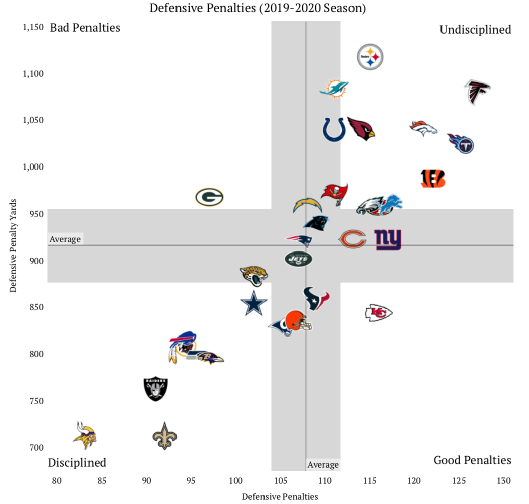 The next two graphics look at offensive and defensive penalties committed. Bad penalty teams are those with a low number of penalties, but high number of penalty yards. Good penalty teams are those with a higher than average number of penalties, but lower number of penalty yards. Disciplined teams are below average in both categories, while undisciplined teams are above average in both.