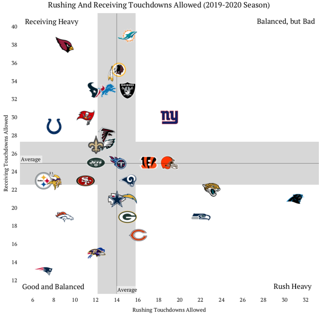 The final two graphics look at how a team scored or allowed touchdowns, either rushing or receiving. Receiving heavy teams score more receiving touchdowns than average, but less rushing. Rush heavy teams score more rushing touchdowns than average, but less receiving. Good and balanced score more receiving and rushing touchdowns than average. Balanced, but bad score less than average in both categories.