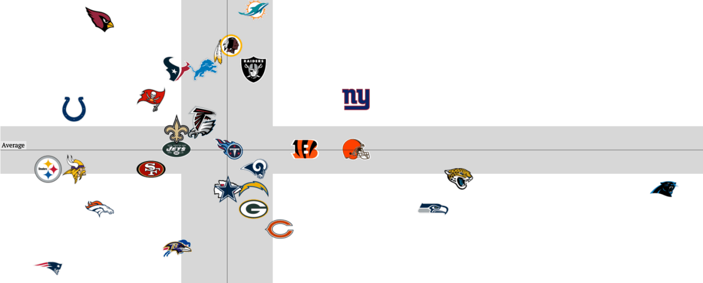 The New Orleans Saints, Atlanta Falcons, and Detroit Lions were in both receiving heavy categories. Offensively this isn’t too surprising with Drew Brees, Matt Ryan, and Matthew Stafford as their quarterbacks. These are all players who can certainly throw the ball well.