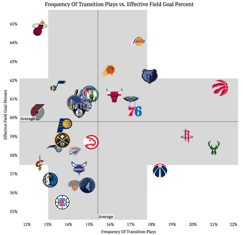 The Miami Heat are an interesting case. They are tied for the second least transition play frequency at 12.6%, but they have an effective field goal percentage of 64.8% on those transition plays.