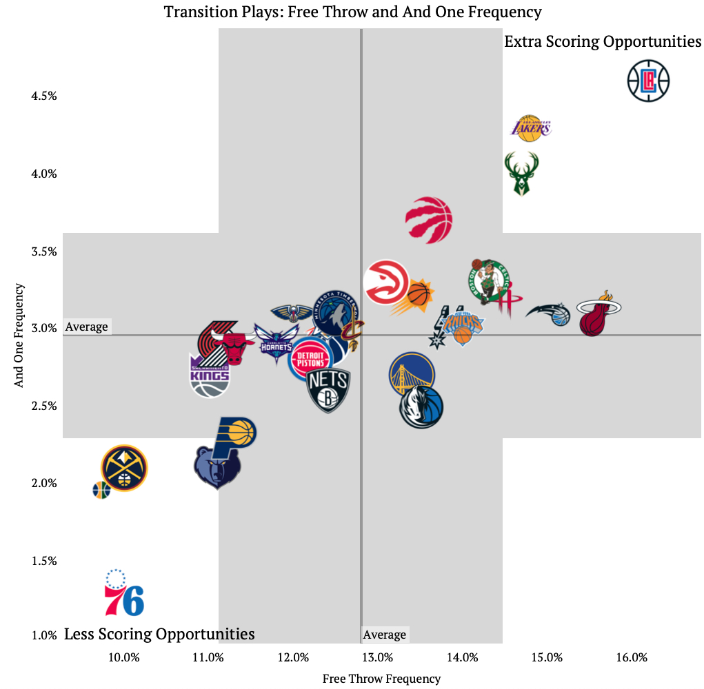 The L.A. Clippers, Los Angeles Lakers, and Milwaukee Bucks are the three teams with the most extra scoring opportunities. The Clippers have a free throw frequency of 16.2% on their transition plays and an and one frequency of 4.6%.