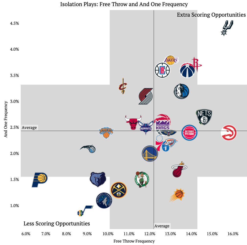The San Antonio Spurs are the only team with a significant number of extra scoring opportunities on isolation plays, with 15.7% of them resulting in free throws and 4.4% of them ending with and ones.