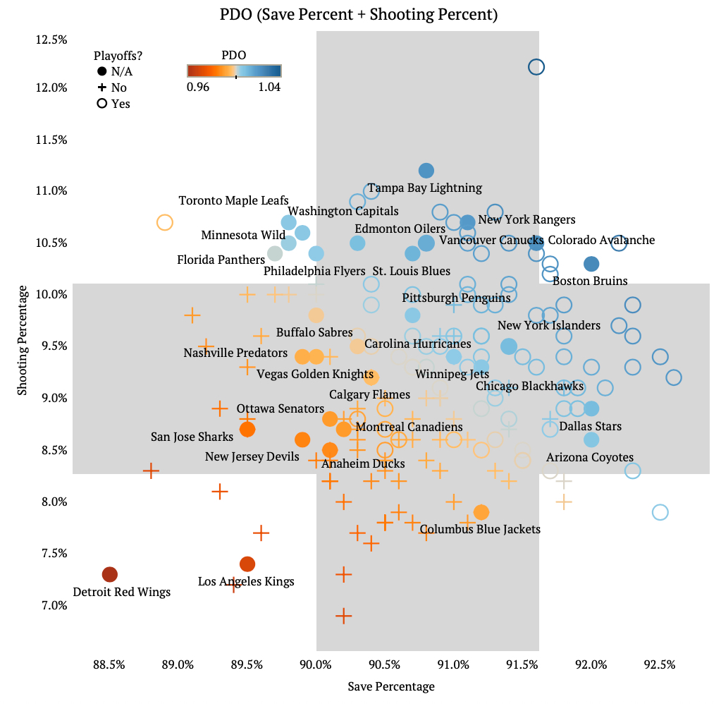 The third graphic looks at teams’ PDO, which is the sum of their save and shooting percent. It can be used as an indicator of how lucky a team is. The color of the shapes represent the teams’ PDO, while the shape represents if they made the playoffs or not.