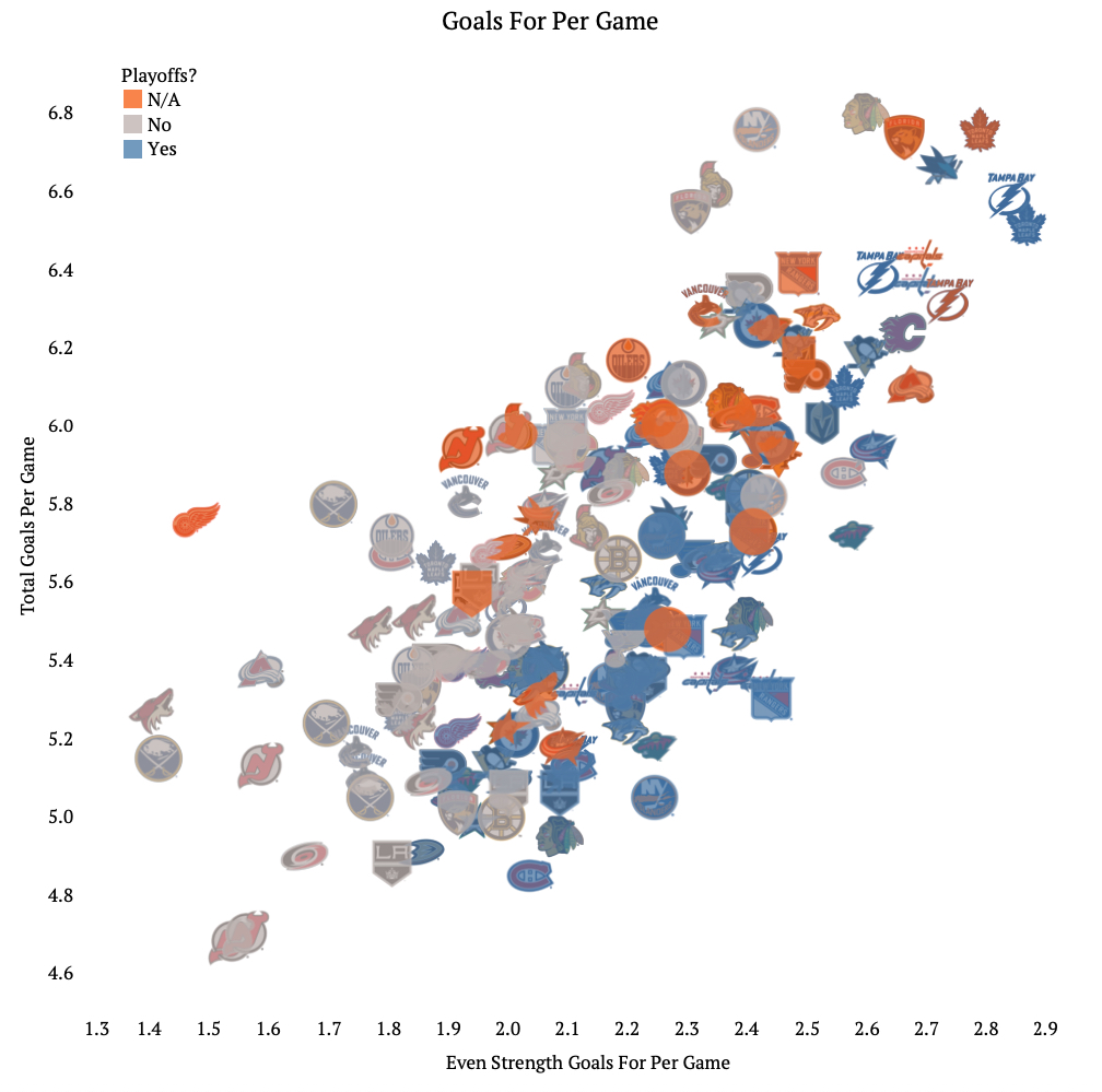 It is clear from the final graphic that teams who score more even strength goals usually make the playoffs, but one big exception to this is the Florida Panthers who currently are on the outside looking in.