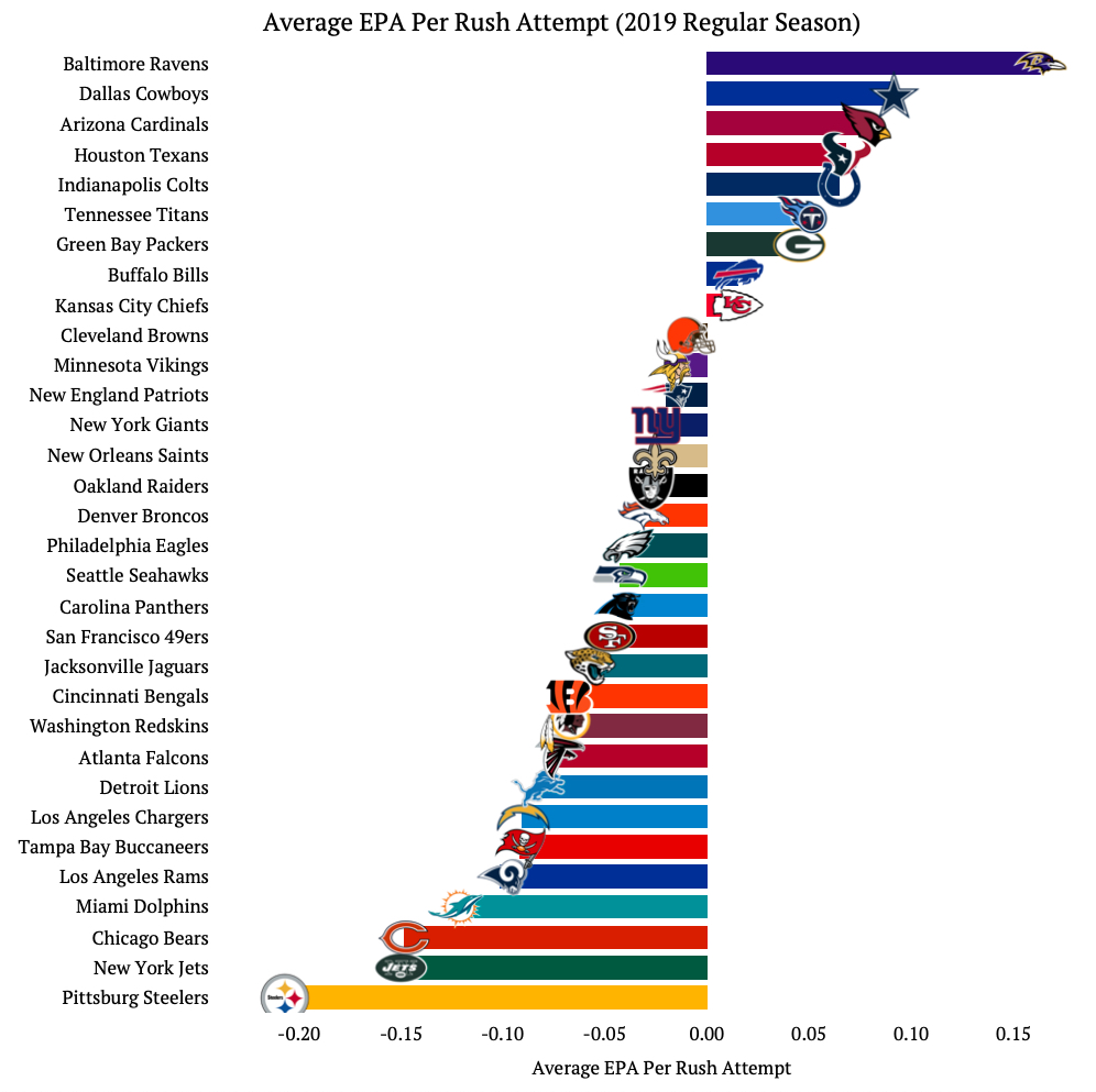 The next graphic is similar to the first, except it is looking at average EPA per rush attempt.