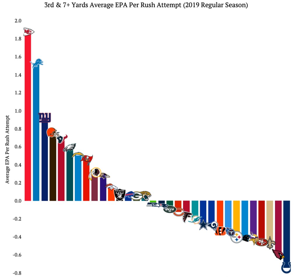 The first two graphics will look at how team’s EPA compare to one another when a team decides to run the ball on third and long. The first graphic shows average EPA per rush attempt on 3rd and 7+ yards to go while the second graphic shows average EPA per rush attempt on 3rd and 10+ yards to go.