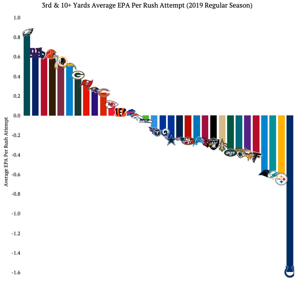 The Indianapolis Colts were not good running the ball on 3rd and long situations last season. Averaging about -.8 EPA on 7+ yards and about -1.6 EPA on 10+ yards.