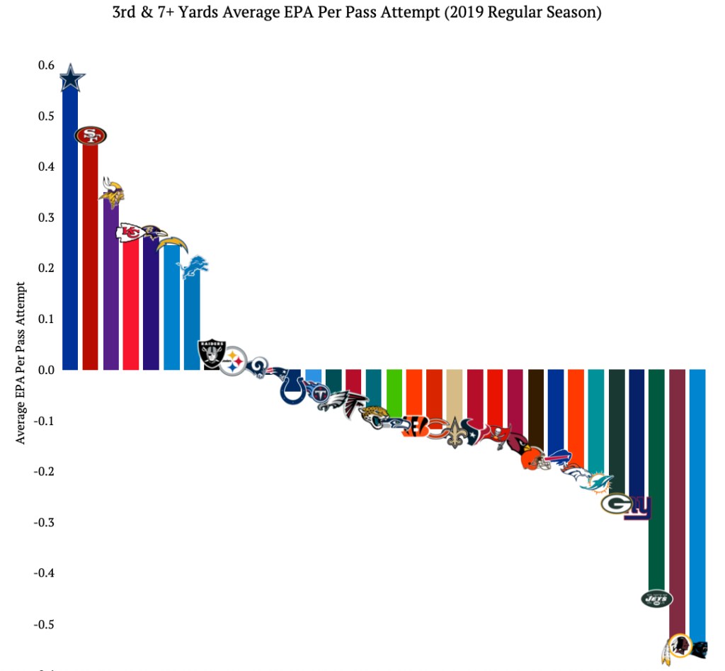 The next two graphics are similar to the first two, but rather than average EPA per rush attempts, they look at average EPA per pass attempts on 3rd and long situations. Again, the first graphic is 3rd and 7+ yards to go and the seconds is 3rd and 10+ yards to go.