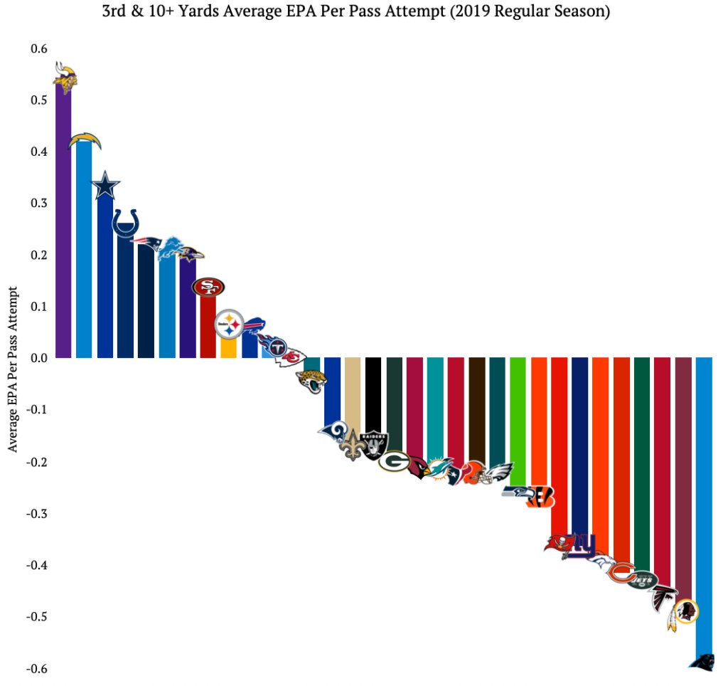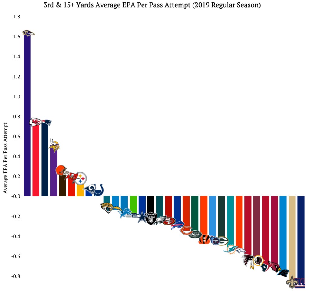 The next graphic looks at a rather dire situation in football, the 3rd and 15+ yards. Again, the graphic is showing average EPA per pass attempts, because in 3rd and 15+ yards a team would almost never run the ball.