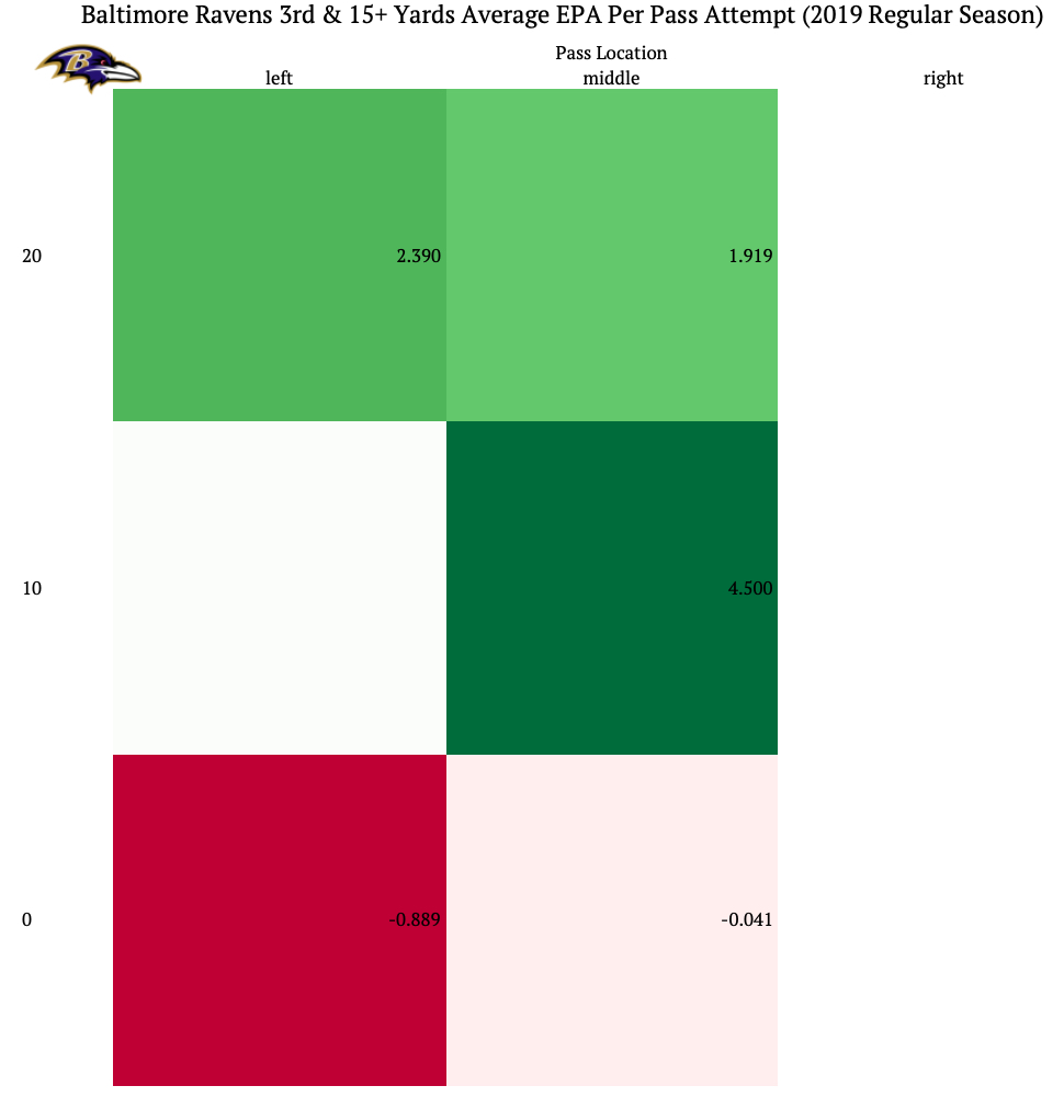 The final two graphics are an extension of the one above. I mapped the Baltimore Ravens and Kansas City Chiefs average EPA per pass attempt on 3rd and 15+ yard situations. This will give more insight into how these teams managed to be in the top two spots above.