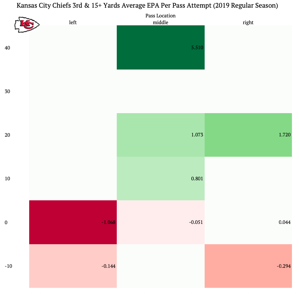 The Kansas City Chiefs on the other hand preferred the center of the field and they also took some deep shots on 3rd and 15+ situations. The above graphics show how different teams can approach the same situation in a football game.