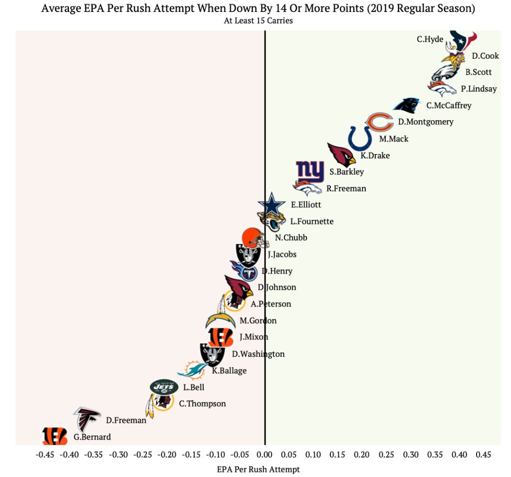 The first graphic will look at how players did when rushing the ball by down 14 or more points and with at least 15 carries. The black line indicates a 0 average EPA per attempt, the area to the left of the line is negative average EPA per rush attempt while the area to the rights of the line is positive.
