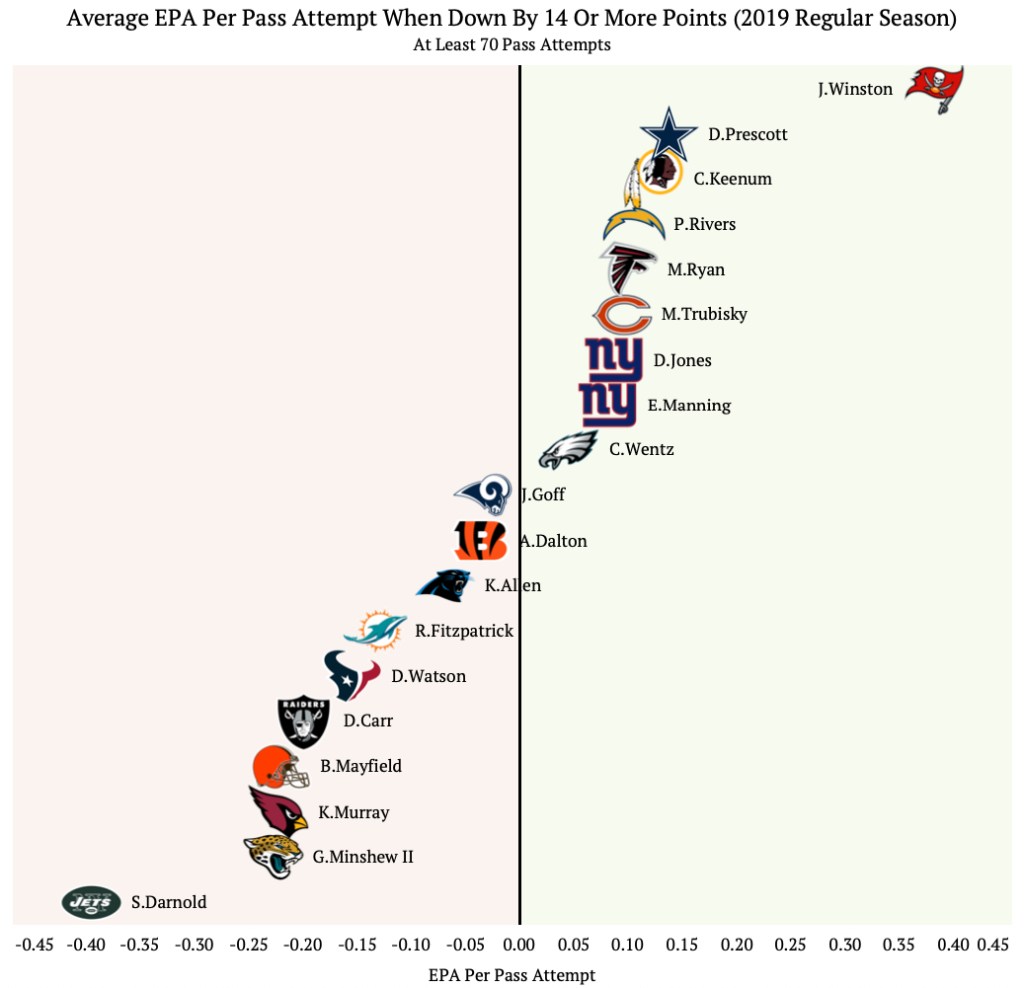 All graphics in this post will be looking at EPA statistics from the 2019 NFL regular season when the team is down by 14 or more points.