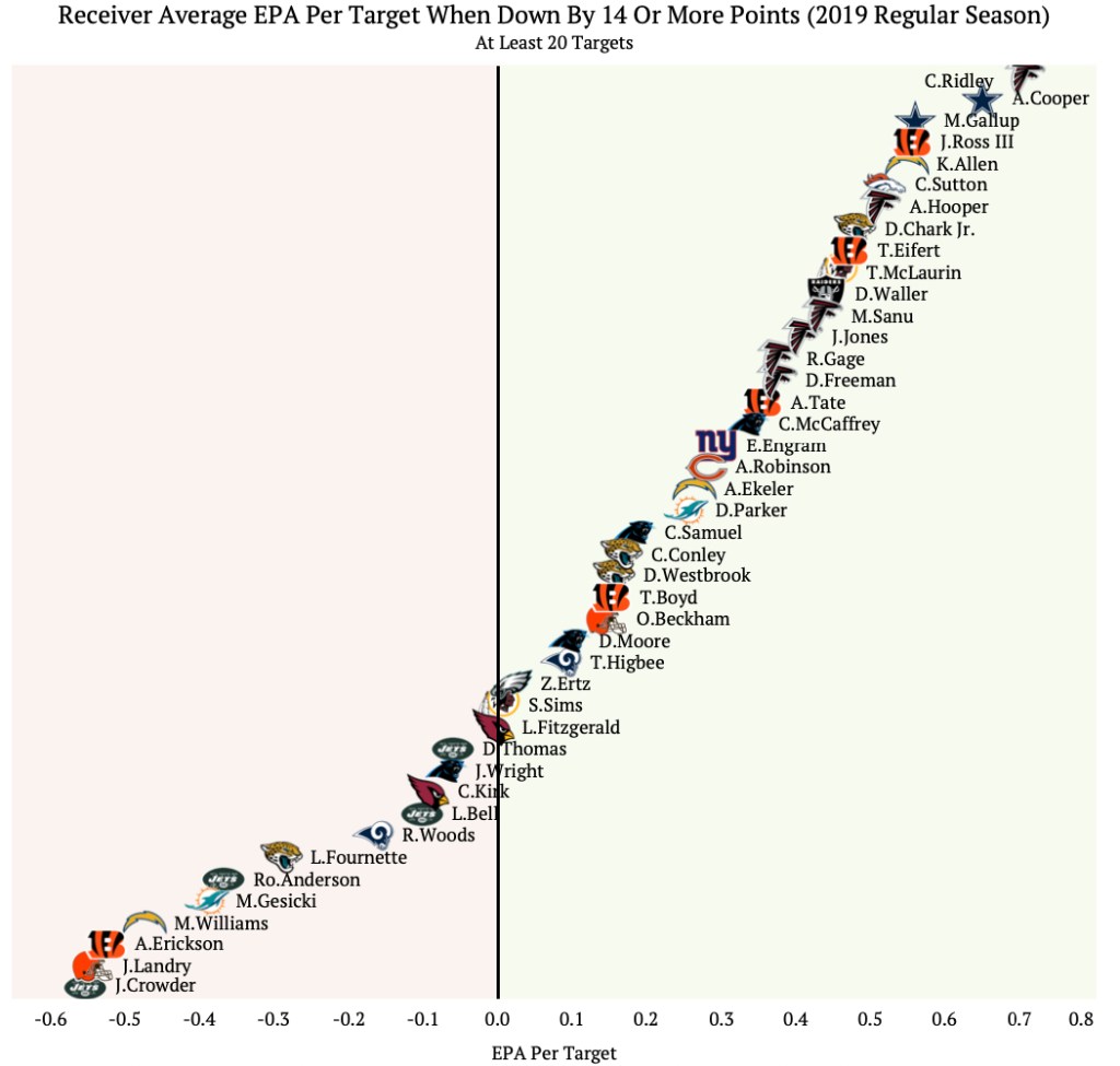 The second graphic looks at receivers’ average EPA per target when down by 14 or more points last season, with at least 20 targets.