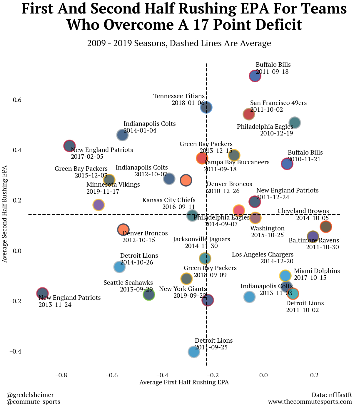 Teams are certainly more scattered here than with passing, but the same general trend holds: teams that comeback to win ran the ball better in the second half.