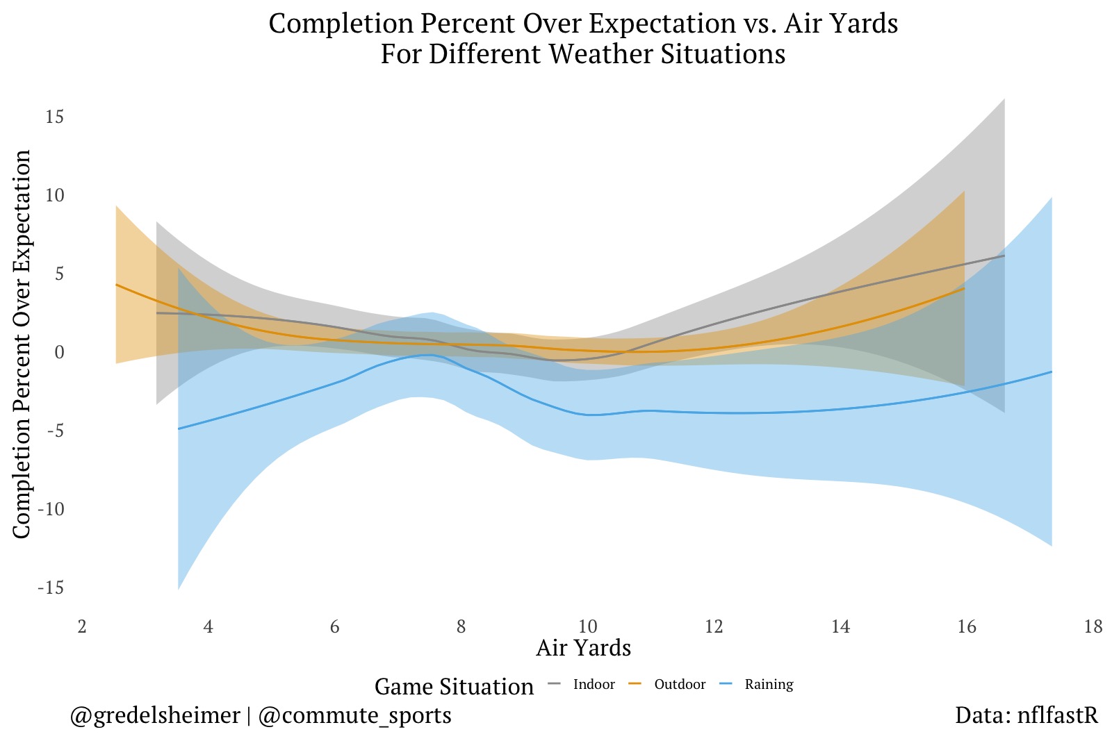 First, I looked at completion percent over expectation (CPOE) (this is a measure how how good a throw is, higher CPOE means a pass was completed when it had a low completion probability) by air yards for three different game environmental situations: indoor games, outdoor games, and outdoor games where it was raining.
