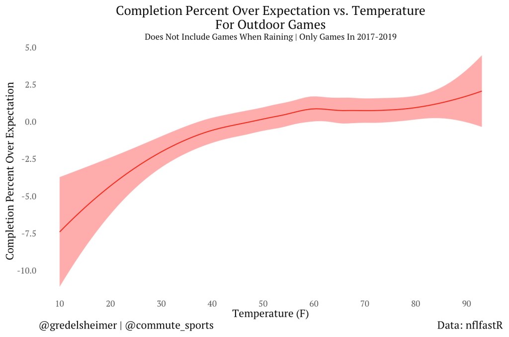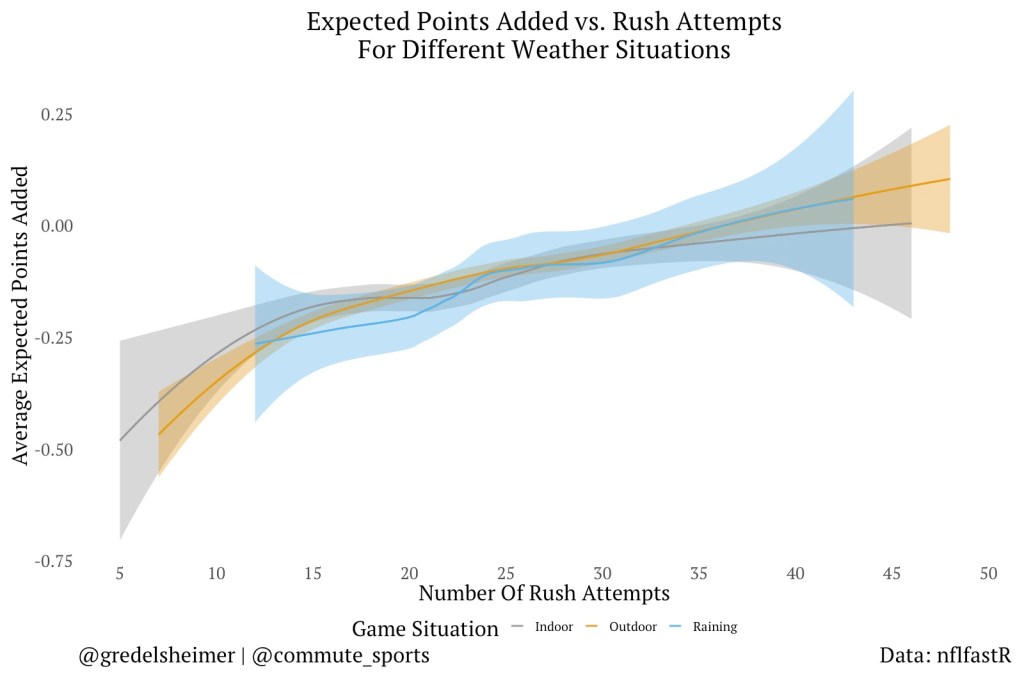 We see that indoor and outdoor games really follow the same track, but when it’s raining throws are completed at a lower level. It is, of course, harder to complete passes in the rain.