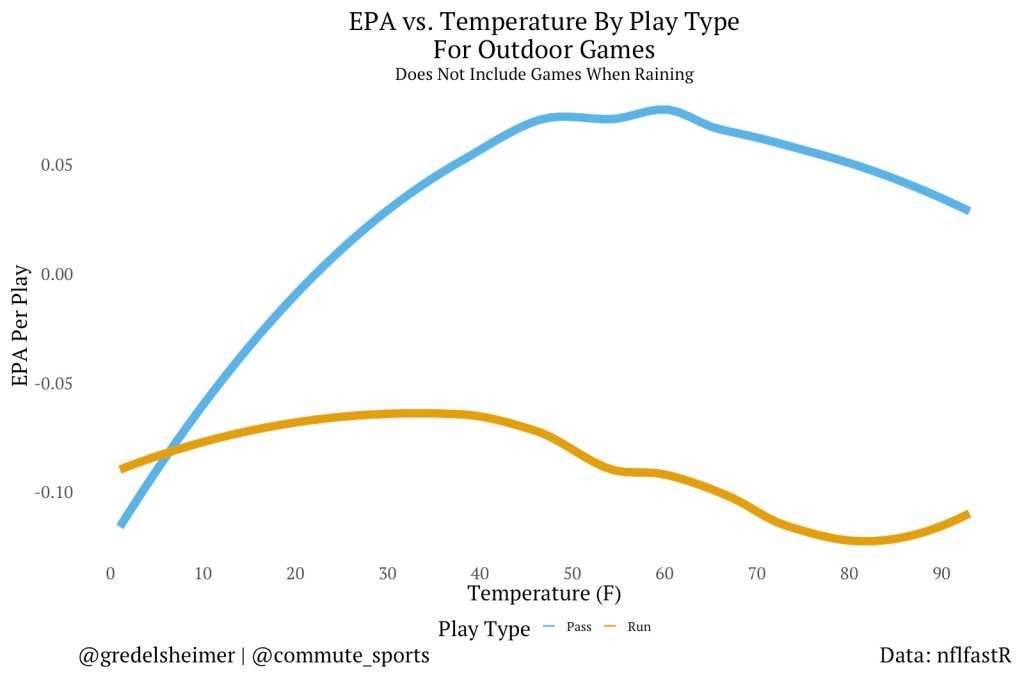 Now, correlation does not mean causation, but it is interesting to see running plays become less efficient as the temperature increases while passing plays do the opposite – become more efficient as the temperature increases.