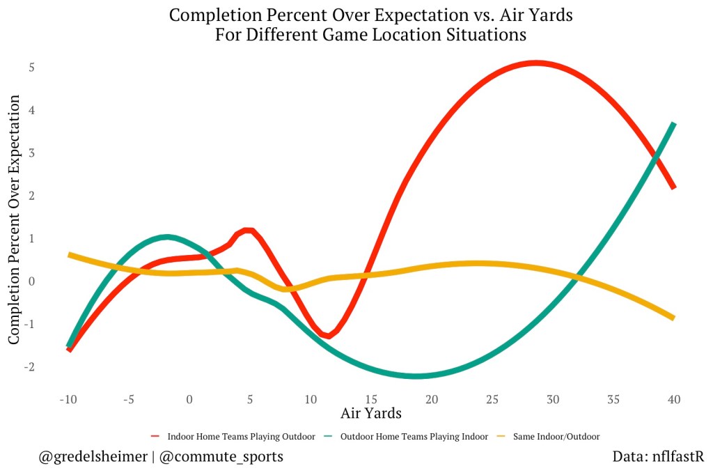 The passing result surprised me. Often we hear about outdoor teams being able to throw the ball deeper than normal in a dome, which we do see the the data support, but we never hear about indoor teams completing passes better when playing outdoors, which the data also supports.