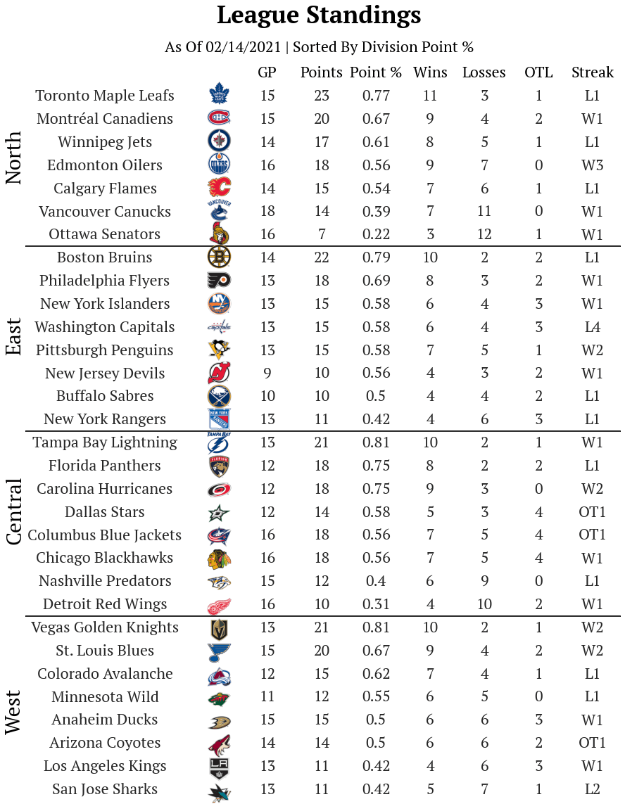 The 2020-2021 NHL season is underway (although it’s really just the 2021 season) and I wanted to look at the standings of the league and see how each team is playing thus far.