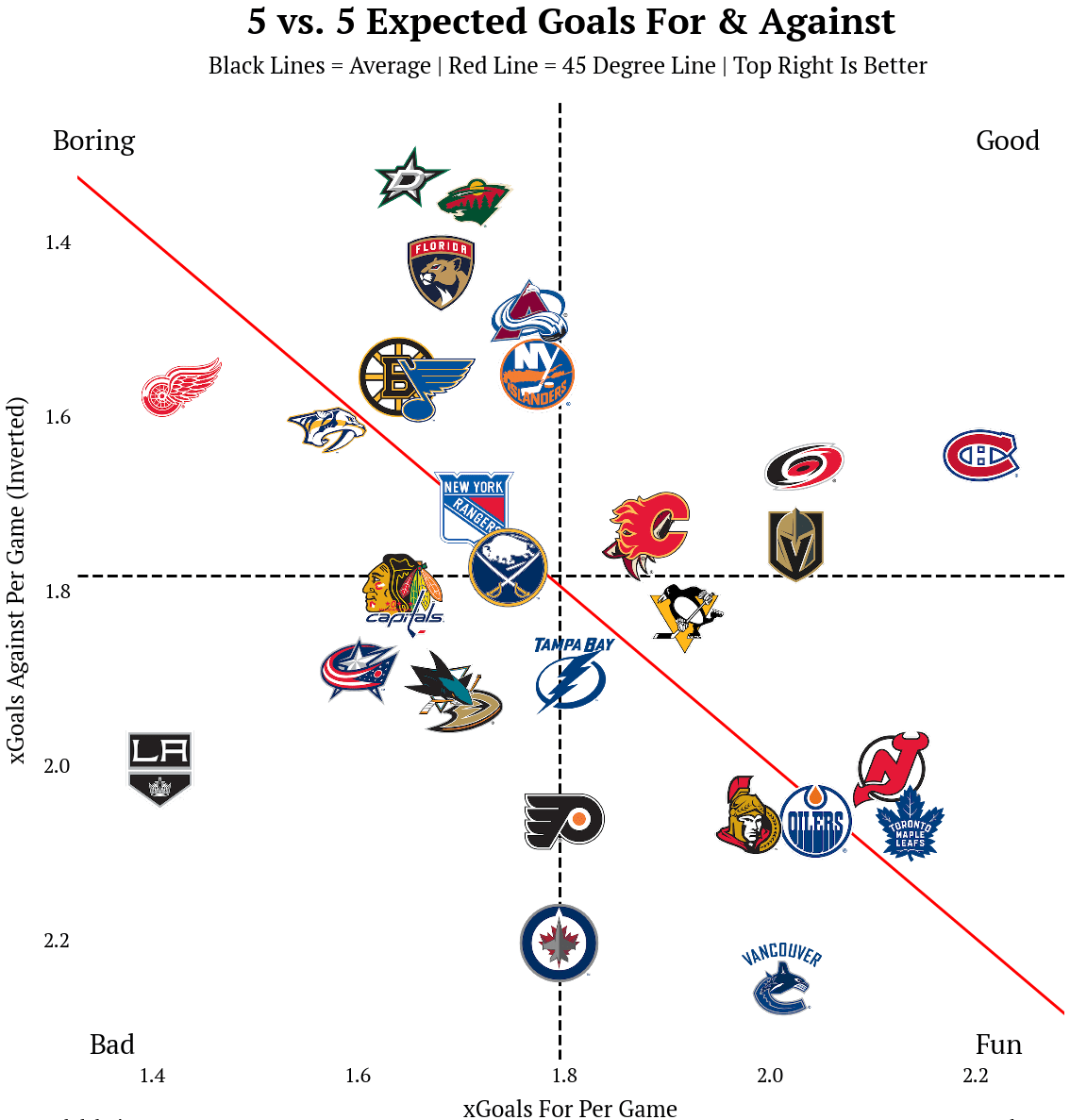 If you want to watch some fun hockey, I’d suggest tuning into a Toronto Maple Leafs vs. Vancouver Canucks game. The only real “Bad” team is the LA Kings, who currently sit in 2nd to last place in the West. The Dallas Stars and Detroit Red Wings are “Boring” – they both just do not generate a lot of xGoals and do not allow a lot either.