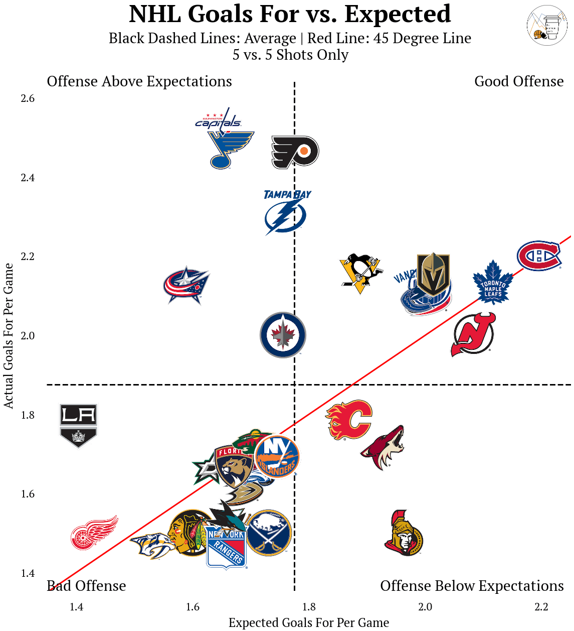 To analyze each team’s offense, I graphed their expected goals per game and compared them to their actual goals per game in 5 vs. 5 situations.