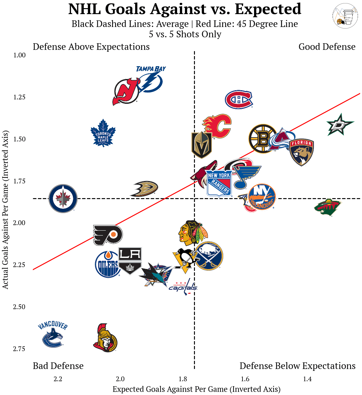The Tampa Bay Lightning and New Jersey Devils are outperforming their expected goal metrics on defense. Keep in mind though that the New Jersey Devils have not played a game in some time due to Covid-19.