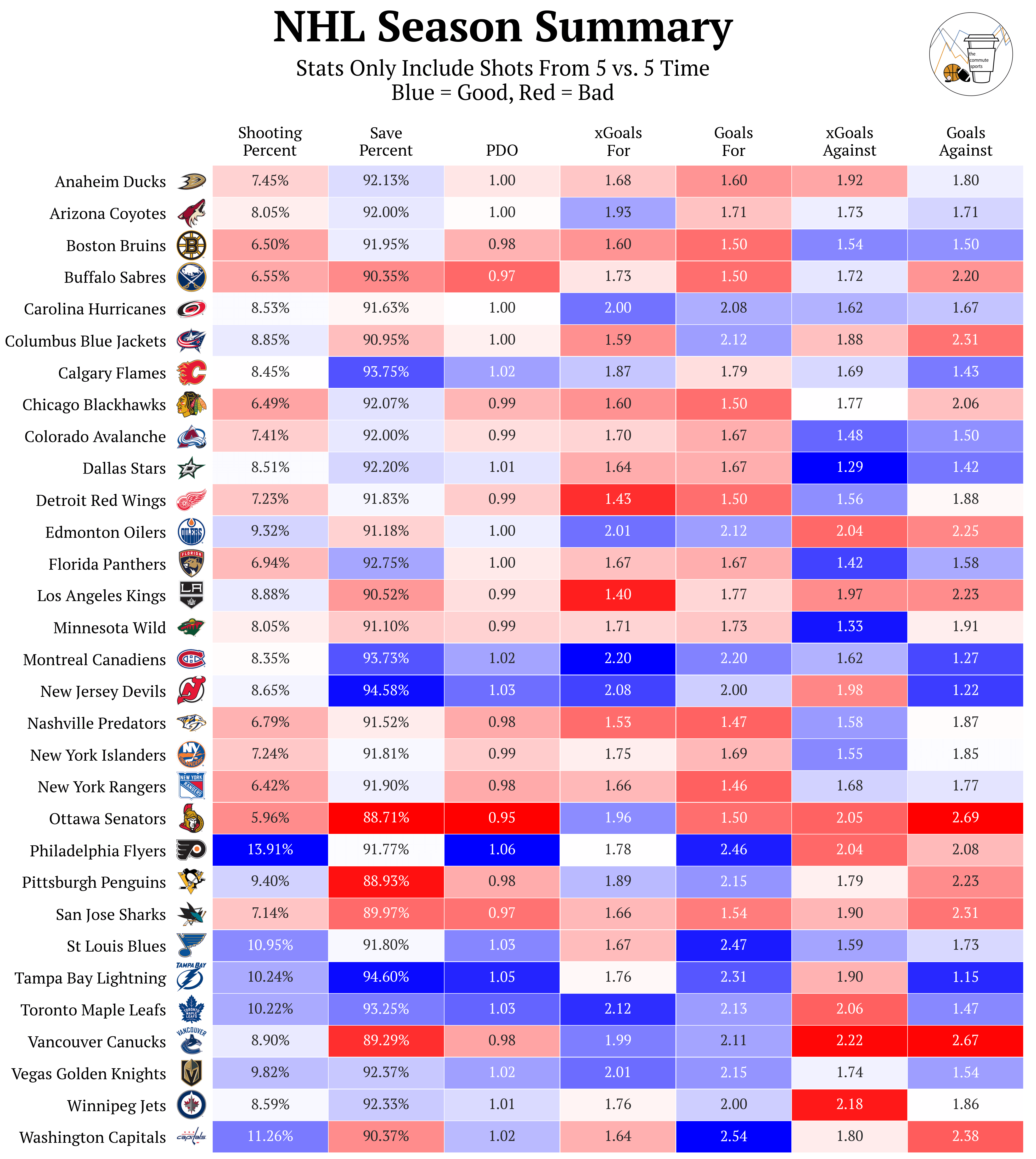 A table summarizing all the stats above, as well as the PDO statistics (Shooting and Save Percent) can be seen below. Red means the team is worse than average while blue means they are better.