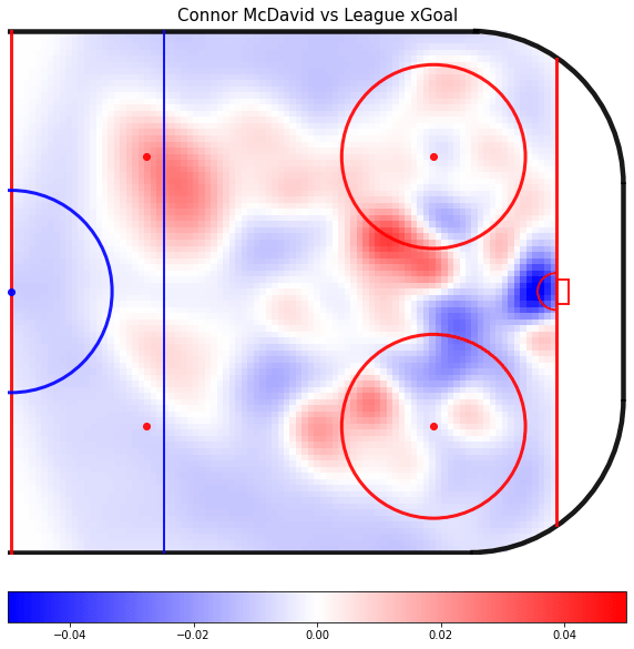 Now, I want to do the same thing for an individual player and see how he compares to the league. This will show us where he gets better and worse chances of scoring from.